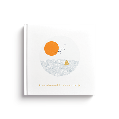 Een kraambezoekboek met de golven van de zee, de zon, vogels en een zeilbootje.