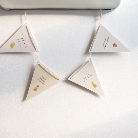 Vlaggetjes geboortekaartje met goudfolie en zomerfruit.