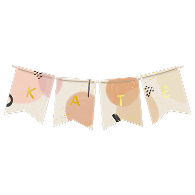 Vlaggetjes / vaandel geboortekaartje met goudfolie geschilderde elementen in rozen tinten en zwarte abstracte vormen.
